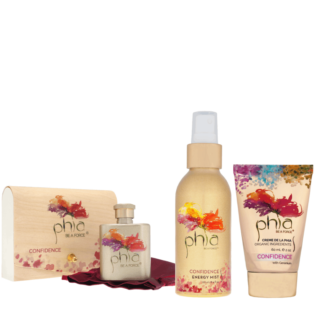 Energy Bouquet — Cocos Nucifera (Coconut) Oil*, Simmondsia Chinensis (Jojoba) Seed Oil*, Tocopherols (Vitamin E), Plant, Flower and Herb Essences, Gem Elixirs. *Organic — Crème de la Phia — Helianthus Annuus (Sunflower) Seed Oil, Soja Hipsida (Soybean) Oil, Deionized Water, Natural Beeswax, Sodium Borate, Aloe Barbadensis (Aloe) Leaf Juice*, Chamomilla Recutita (Matricaria) Flower Extract (Camomile), Phenoxyethanol, Caprylyl Glycol (Optithen), Plant, Flower and Herb Essences, Gem Elixirs. *Organic — Energy Mist — Distilled Water, Aloe Barbadensis (Aloe) Leaf Juice*, Argania Spinosa (Argan) Nut Oil*, Persea Gratissima (Avocado) Oil*, Leontopodium Alpinum (Edelweiss) Flower Extract*, Tocopherols (Vitamin E), Plant, Flower and Herb Essences, Gem Elixirs. *Organic