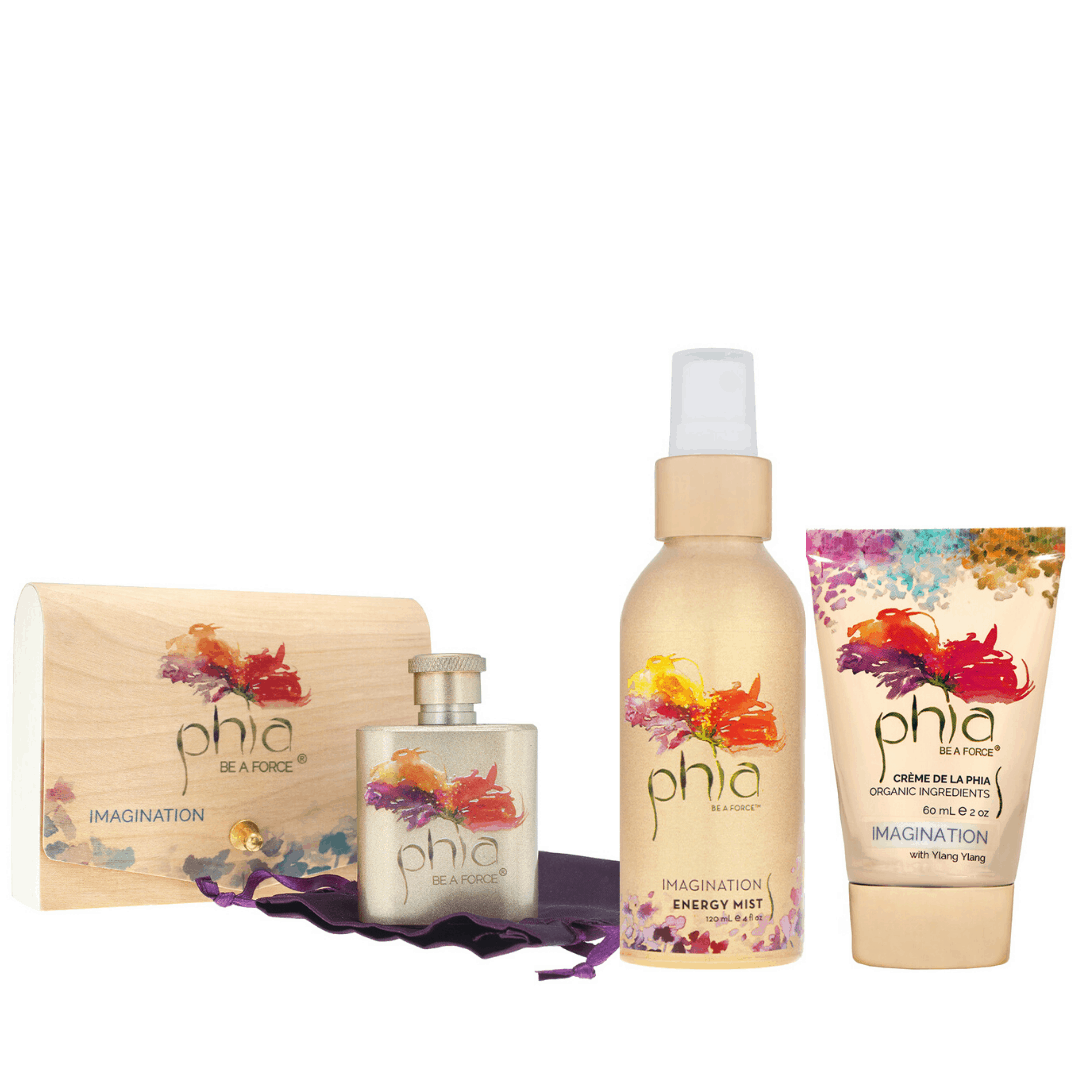 Energy Bouquet — Cocos Nucifera (Coconut) Oil*, Simmondsia Chinensis (Jojoba) Seed Oil*, Tocopherols (Vitamin E), Plant, Flower and Herb Essences, Gem Elixirs. *Organic — Crème de la Phia — Helianthus Annuus (Sunflower) Seed Oil, Soja Hipsida (Soybean) Oil, Deionized Water, Natural Beeswax, Sodium Borate, Aloe Barbadensis (Aloe) Leaf Juice*, Chamomilla Recutita (Matricaria) Flower Extract (Camomile), Phenoxyethanol, Caprylyl Glycol (Optithen), Plant, Flower and Herb Essences, Gem Elixirs. *Organic — Energy Mist — Distilled Water, Aloe Barbadensis (Aloe) Leaf Juice*, Argania Spinosa (Argan) Nut Oil*, Persea Gratissima (Avocado) Oil*, Leontopodium Alpinum (Edelweiss) Flower Extract*, Tocopherols (Vitamin E), Plant, Flower and Herb Essences, Gem Elixirs. *Organic